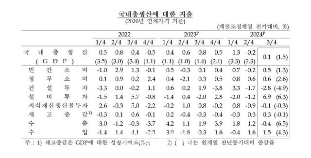 24일 한국은행이 발표한 ‘3분기 실질 GDP 속보치’에 따르면 올해 3분기 전기비 성장률은 0.1%를 기록했다. 올해 1분기 전기비 GDP 증가율은 1.3%를 기록하며 9개 분기 만에 최대치를 기록했으나, 2분기엔 2022년 4분기 이후 처음으로 역성장을 보였다. 3분기 성장률은 전분기가 역성장을 기록한 데 따른 기저효과(기준이 되는 시점에 따라 결과 값이 실제보다 왜곡되는 것)가 컸다는 것이 중론이다. 전문가들은 3분기 역시 2분기가 역성장한 데 따른 기저효과로 전기대비 성장세를 보일 것으로 전망했다.