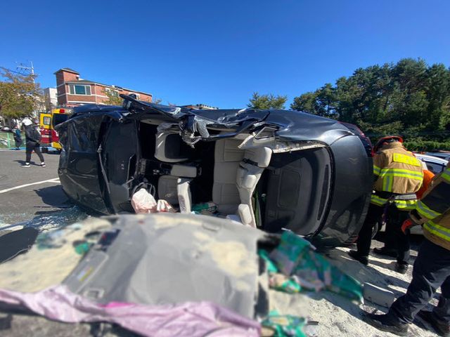 70대 운전자 A씨가 몰던 차가 주차장에 진입한 이후 갑자기 주차된 차량 10대를 들이받고 그 충격으로 차가 뒤집혔다. A씨는 의식이 있는 상태로 중상을 입어 병원으로 이송됐다.