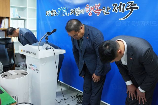현길호 제주특별자치도의회 더불어민주당 원내대표가 지난해 7월 14일 오전 제주도의회 기자실에서 기자회견을 열고 음주운전과 성매수 의혹 등 강경흠 의원(30·제주시 아라동 을)의 잇단 비위사건에 대해 허리 숙여 사과하고 있다 / 뉴스1(제주특별자치도의회 제공)