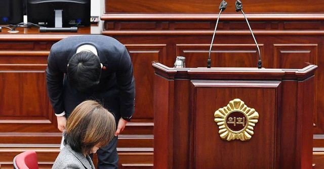 음주운전으로 물의를 일으킨 강경흠 제주특별자치도의회 의원(제주시 아라동 을·더불어민주당)이 지난해 3월 29일 오전 제414회 임시회 제1차 본회의에서 공개 사과하고 있다. 도의회는 이날 본회의에서 강 의원에 대한 징계의 건(공개회의에서의 사과·30일 출석정지)을 가결했다 / 뉴스1(제주도의회 제공)