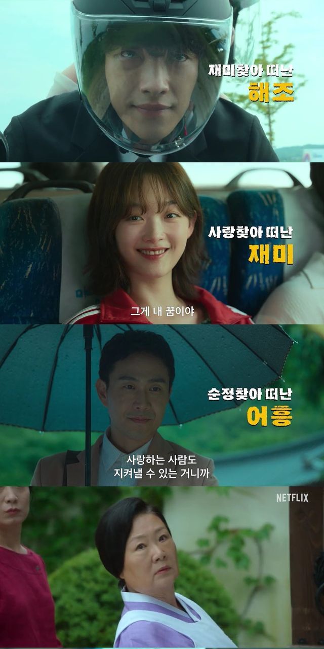 한편, 이름과는 달리 어머니 ‘범호자’(김해숙) 앞에만 서면 깨갱하는 ‘어흥’은 ‘재미’를 위해서는 무엇도 두렵지 않은 순정파로 “호랑이처럼 강해져야 사랑하는 사람도 지켜낼 수 있는 거니까”라는 다짐이 굳세게 돋보인다. 이어 “내가 찾아야 할 사람이 있는데 전국구로 좀 돌아야 될 것 같다”라며 결혼식에 불쑥 찾아온 불청객 해조와 동행하게 된 신부 재미, 재미와의 약속을 지키기 위해 지구 끝까지 따라올 기세로 쫓는 어흥, 그리고 해조 뒤를 바짝 추격하는 칠성의 모습은 이들의 스펙터클한 여정을 짐작케 한다. 예고편 말미 “아무런 목적지 없이 떠돌다가 길을 잃지? 그럼 그건 방황이 아니라 방랑이야, 방랑” 이라며 “나랑 같이 방랑 안 할래?”라는 해조의 물음에 재미가 어떤 선택을 할지도 궁금해진다. 재미 찾아 떠난 해조와 사랑 찾아 떠난 재미, 순정 찾아 떠난 어흥의 방랑 끝에 과연 무엇이 기다리고 있을지 기대를 더한다.