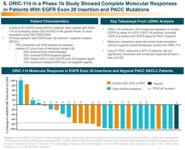 오릭이 공개한 임상1b상(NCT05315700) 데이터에 따르면 ORIC-114는 완전분자반응(complete molecular response) 67%(18/27명)의 결과를 보였다. 이는 ORIC-114로 치료받은 암환자의 혈액의 ctDNA(circulating tumor DNA)에서 mEGFR VAF(variant allele frequency)를 분석한 결과다.
