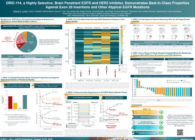오릭은 23일(현지시간) 미국 샌디에이고에서 열린 EORTC/NCI/AACR 2024(ENA 2024)에서 EGFR/HER 엑손20(exon 20) 저해제 ‘ORIC-114(VRN07)’의 임상1b상의 일부 결과를 발표했다.