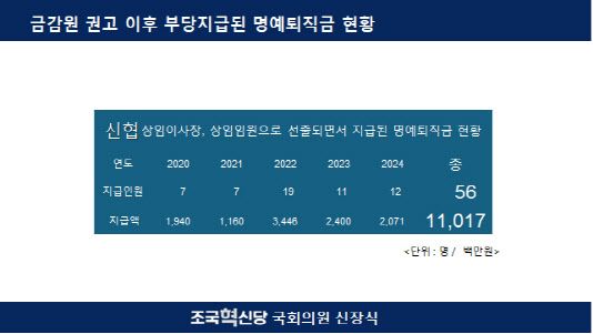 24일 신장식 조국혁신당 의원이 신협중앙회로부터 받은 자료에 따르면, 지난 5년간 전국 51개 조합에서 56명에게 퇴직금에 더해 명예퇴직금을 지급한 것으로 파악됐다. 이 금액은 총 110억1700만원이다.