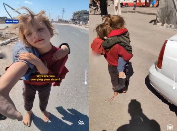 지난 21일(현지 시각) 튀르키예 국영 통신사 아나돌루는 공식 엑스(X·옛 트위터)에 한 팔레스타인 소녀가 다리를 다쳐 걷지 못하는 동생을 어깨에 둘러업고 폐허가 된 가자지구의 거리를 걸어가는 모습이 담긴 영상을 공개했다.