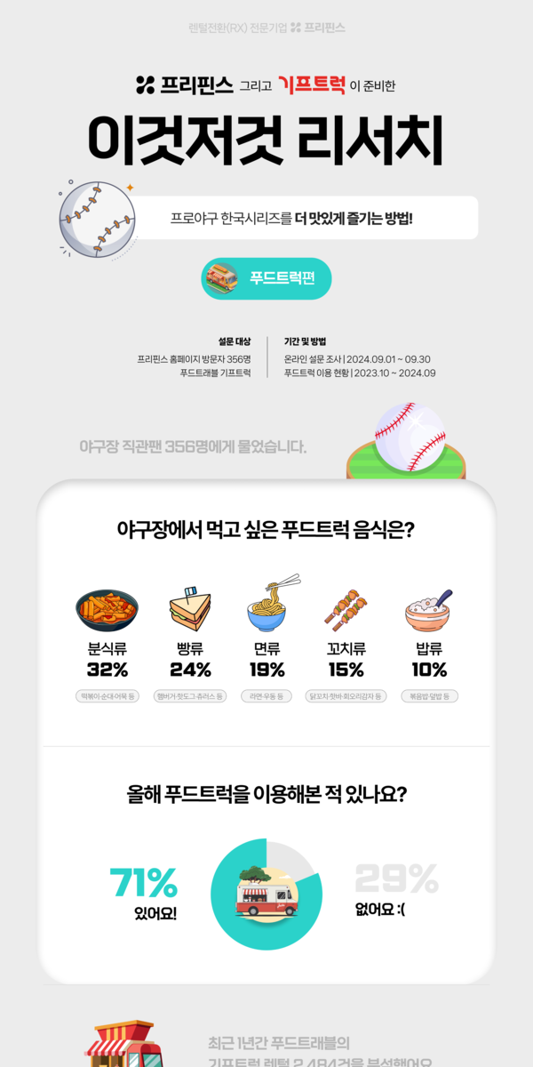 한편, 렌털전환(RX) 전문기업 프리핀스와 푸드트럭 스타트업 푸드트래블이 프로야구 한국시리즈를 기념해 '이것저것 리서치: 푸드트럭편'을 10월 24일 발표했다.