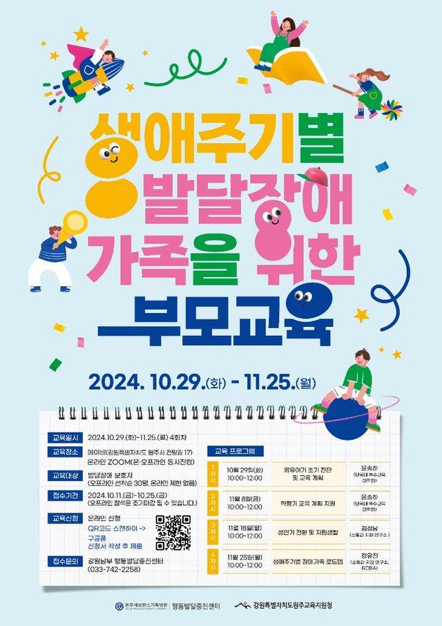 교육 신청 접수는 25일까지 안내 포스터 속 QR코드를 통해 선착순으로 30명을 모집하며, 참가비는 무료다. 자세한 사항은 강원남부 행동발달증진센터를 통해 확인할 수 있다.