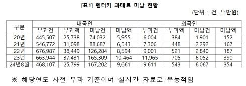 한편 내국인 렌터카 과태료 미납 건수 또한 증가하는 추세다 . 최근 5년간 내국인 렌터카 이용자의 과태료 미납액은 412억원에 달했다. 미납율 역시 2022년 18.7%에서 2023 년 24.9%로 늘었다.