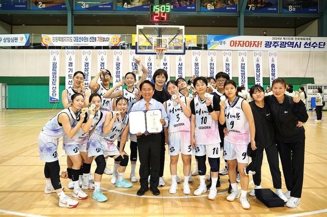 울 서대문구는 박찬숙 감독이 이끄는 서대문구청 여자농구단이 제105회 전국체육대회 농구 여자일반부 결승에서 김천시청을 꺾고 금메달을 차지했다고 18일 밝혔다. 사진은 이성헌 서대문구청장이 서대문구청 여자농구단 선수 및 박찬숙 감독 등 코치진들과 기념 촬영하는 모습. / 서대문구 제공.