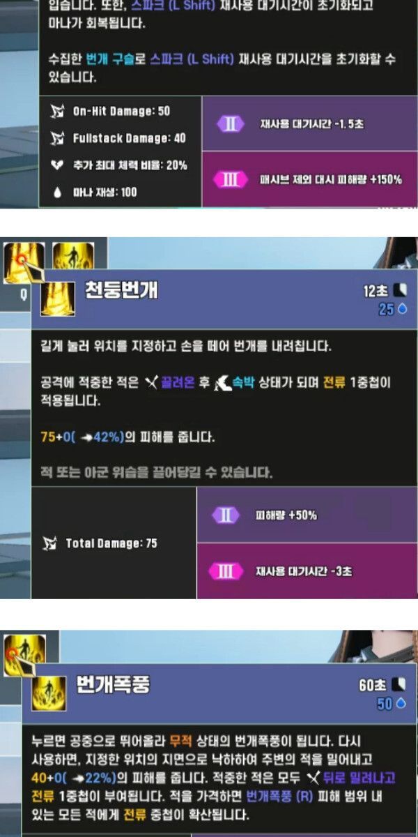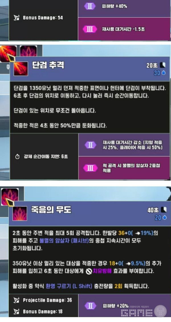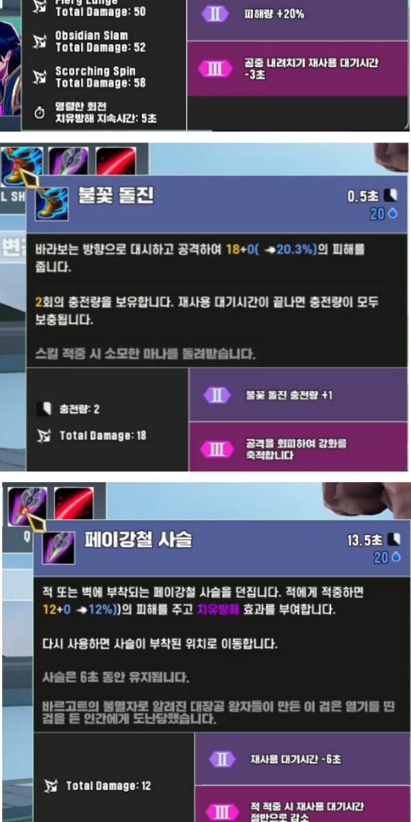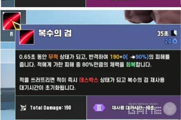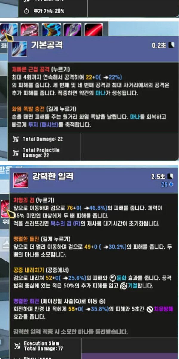 강력한 일격은 누르기, 길게 누르기, 공중에서, 페이강철 사슬로 이동 중 등 상황과 키 입력에 따라 49에서 -76까지 피해 량이 달라진다. 궁극기 복수의 검에도 적에게 가한 피해 중 80%만큼의 체력을 회복하는 등 회복 기술이 곳곳에 들어가 있는 것이 1티어의 비결인 것으로 분석된다.