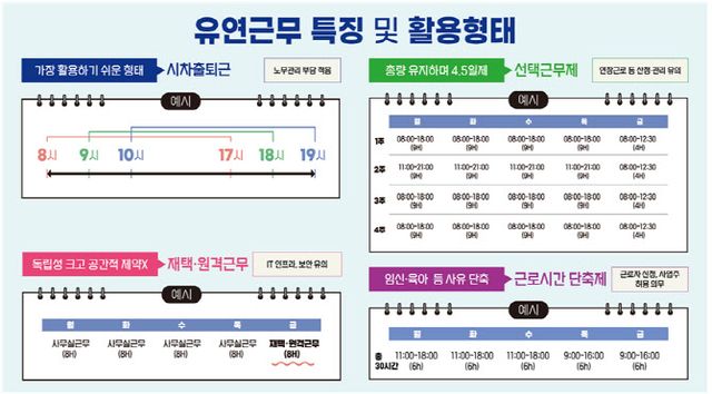 유연근무를 도입하고 싶어도 관련 규정을 몰라 어려워하는 사업주를 위해 정부가 ‘일·생활 균형을 위한 유연근무 활용 매뉴얼’을 24일 발간했다. 시차출퇴근, 선택근무제, 재택·원격근무, 근로시간 단축제 등 4가지 제도를 소개한다. 유연근무 도입 기초단계의 설문조사 예시부터 선택 가능한 실제 모델, 취업규칙 개정 등 요건, 초과근무 등 관리의 유의점과 같은 실무상 유용하게 활용할 수 있는 방법을 160 페이지 분량에 세세하게 담았다.