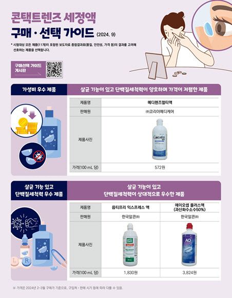 한국소비자원은 소프트렌즈용 다목적 세정액 11개 제품에 대해 단백질세척력과 안전성, 살균효력 등을 시험했더니 이 같은 결과가 나왔다고 24일 밝혔다.