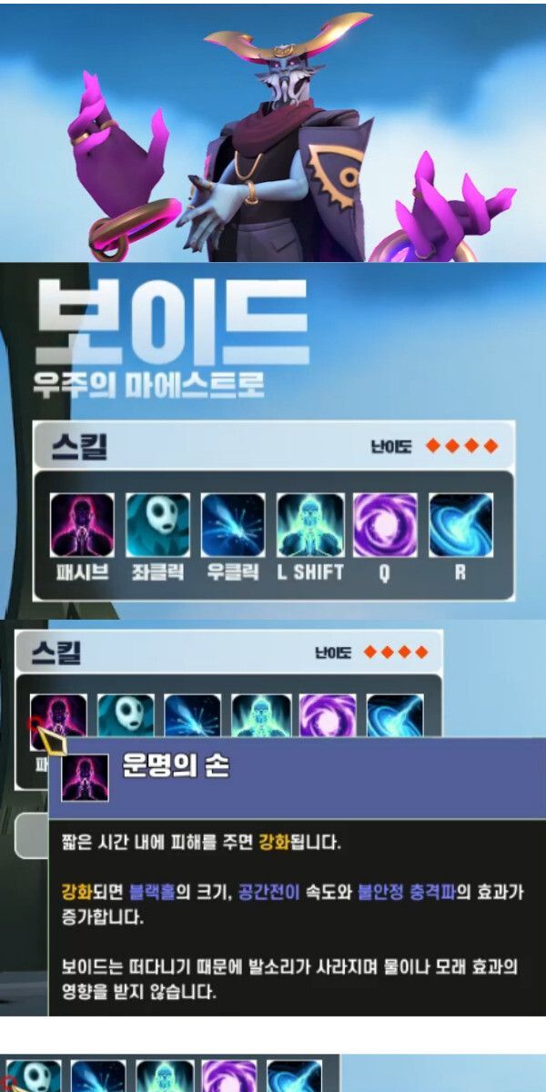 보이드는 일본의 장수 카부토를 닮은 외관이 특징이다. 기본 공격이 140으로 좋은 편이다. 공격이 강화가 되면 크기와 속도, 효과가 증가한다. 떠나니기 때문에 발소리가 사라지는 특징이 있다. 그렇다면 절벽도 건너 다니는? 파편을 발사하면 상대를 기절 시킨다. 투사체를 던져 떨어진 지점으로 순간이동이 가능하며, 폭탄을 설치하여 피해를 주고 적을 속박시키기도 하는 보이드는 컨트롤러다. 전체적으로 높은 티어는 아니다.