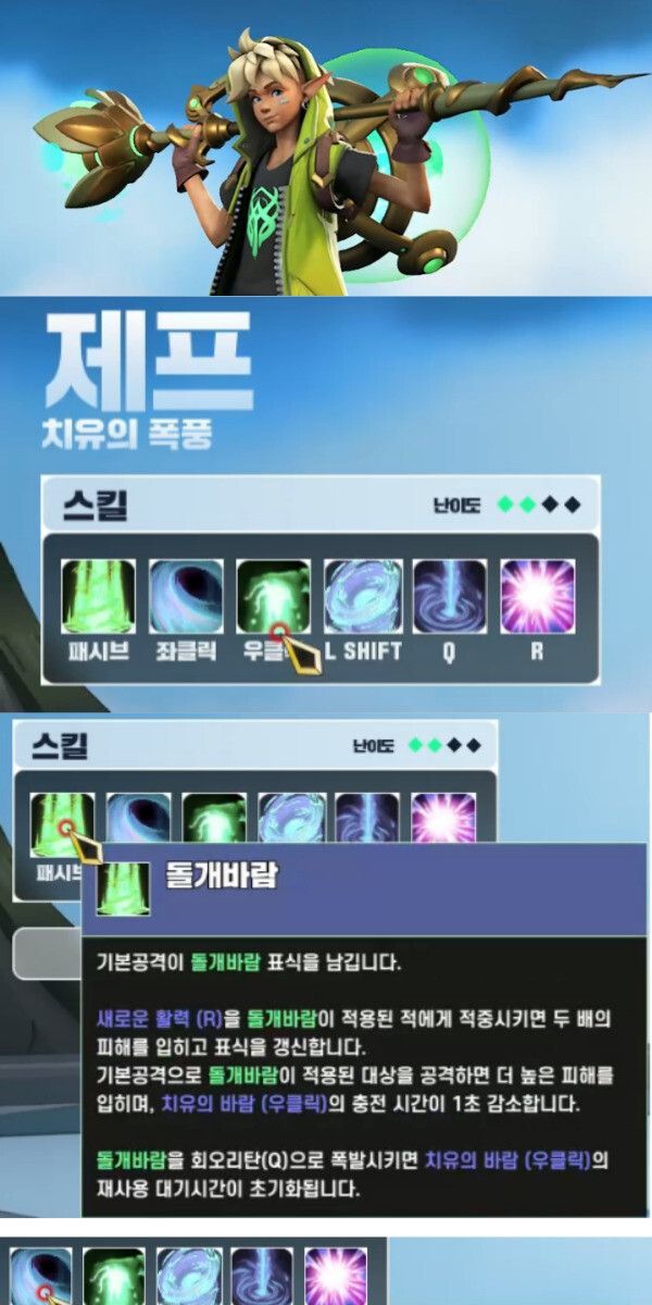 제프도 엘루나와 같은 치유 계열이다. 치유의 바람은 아군에게 125의 체력을 회복시킨다. 궁극기 새로운 활력은 직선형 돌풍으로 아군을 치유하고, 적에게 100의 피해를 준다.