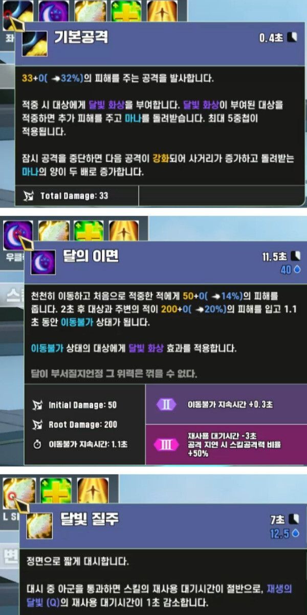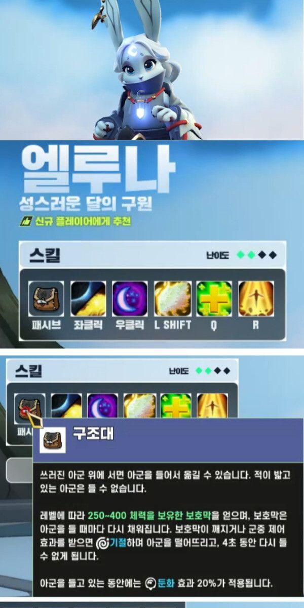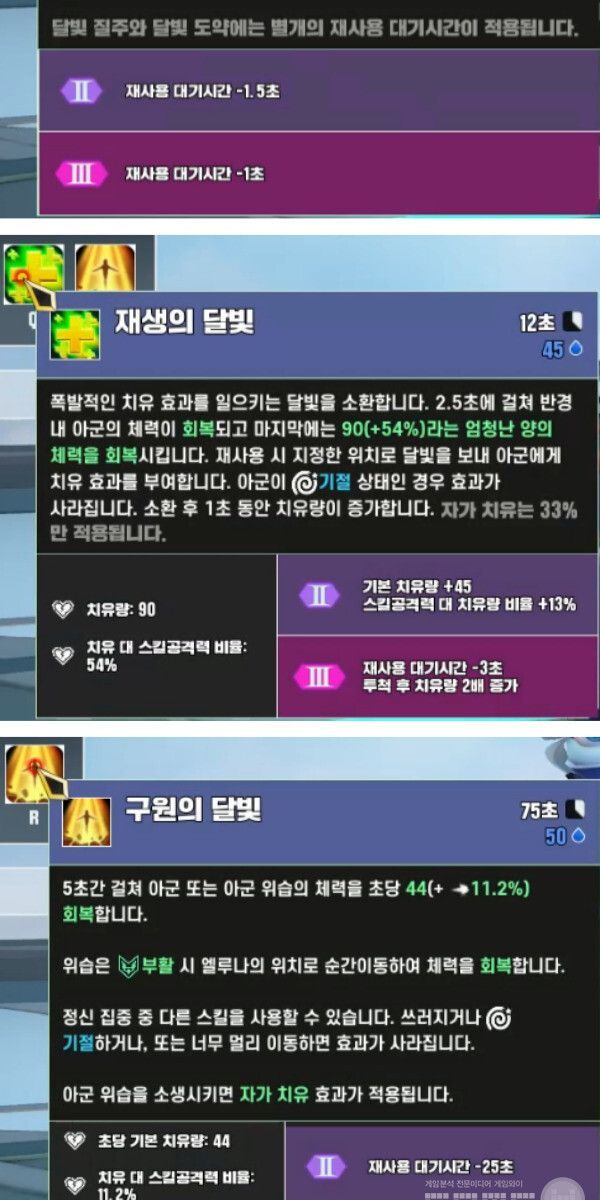 다만 쓰러운 아군 위에 서면 아군을 들어서 옮길 수 있거나 폴발적인 치유 효과를 일으키는 달빛을 소환, 범위 내 아군의 90의 체력을 회복시키는 힐러 기능에 특화되어 있다고 볼 수 있다. 궁극기도 5초간 초당 44씩 체력을 회복하는 것이어서 치유와 체력 회복에 특화된 힐러라고 보면 되겠다.