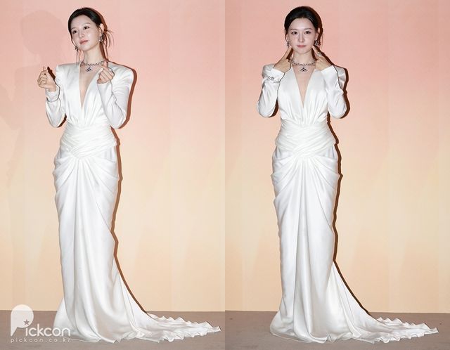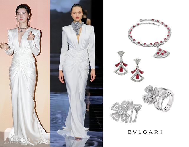 이날 김지원은 고급스러운 화이트 실크 롱 드레스를 착용하고, 다이아몬드와 루비로 이루어진 붉은 톤의 주얼리를 매치해 우아하면서도 고혹적인 분위기를 풍겼다. 깊이 파인 V넥라인과 파워숄더, 그리고 허리선의 드레이프 디테일로 여성스러움을 극대화 시켰다.