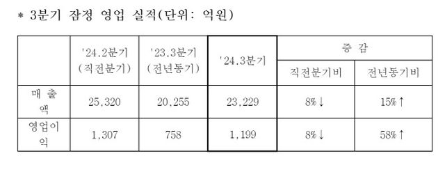 매출은 하계휴가와 추석 연휴 등의 계절적 요인으로 조업일수가 감소하면서 전분기 대비 8% 감소했으나, 지난해 같은 기간과 비교하면 15% 증가했다.