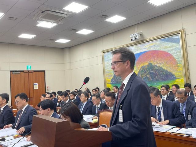 피터 덴우드 애플코리아 대표가 24일 열린 국회 정무위 국정감사에 모습을 드러냈다. = 김정후 기자