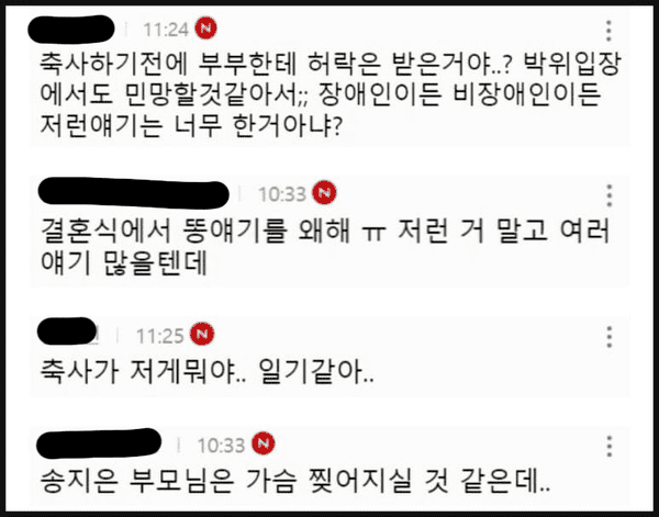 네티즌들은 "킁킁 대면서 냄새 맡는 제스처 완전 사이코패스 같다" , "송지은 부모님이 그런 말을 들었을 때 얼마나 속상했을지 생각 안 하냐" , "여자 쪽 부모님 가슴이 찢어질 것 같다" , "축사 때 누가 배설물 얘기를 하냐" 등의 반응을 보였다.