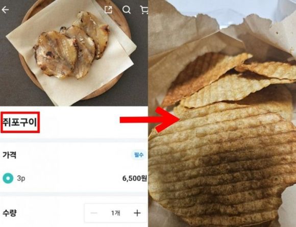 A씨가 함께 공개한 사진에는 가게 측이 배달 어플에 올린 쥐포 구이 사진과 그가 배달받은 음식 사진이 담겼다. 배달 어플 사진 속 쥐포 구이는 쥐치를 말려 구운 모습으로, 가격은 3장에 6500원이다. 그러나 A씨가 실제로 배달받은 음식은 영락없는 과자의 모습이다.