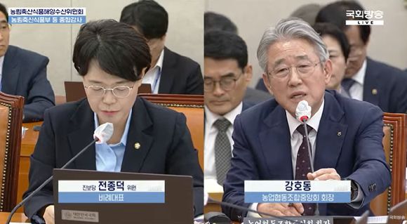 이날 전종덕 위원은 "중앙 인사의 연임을 허용하는 안건이 지난 17일 전에 완성됐다는데, 지난 18일 농협중앙회 국정감사에서 강 회장이 연임할 생각이 없다고 말한 건, 강 회장의 허위 보고였던 것"이라고 지적했다.