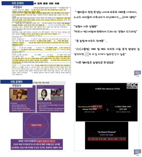 또 민형배 의원은 하이브가 내부 공유하는 위클리 음악산업 리포트를 공개해 파장을 일으켰다. 해당 리포트에는 하이브 직원들이 타 연예 기획사의 미성년자 가수들에 대한 원색적이고 질 낮은 반응들을 모아놔 충격을 안겼다.