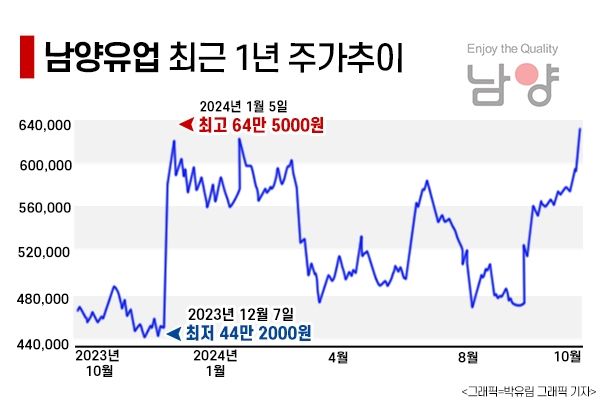 24일 오후 1시 50분 기준 남양유업 주가는 전 거래일 대비 6.55% 상승한 63만4000원에 거래되고 있다. 남양유업 주가는 지난달부터 꾸준히 우상향해 두 달 만에 131.13% 넘게 오른 상태다.