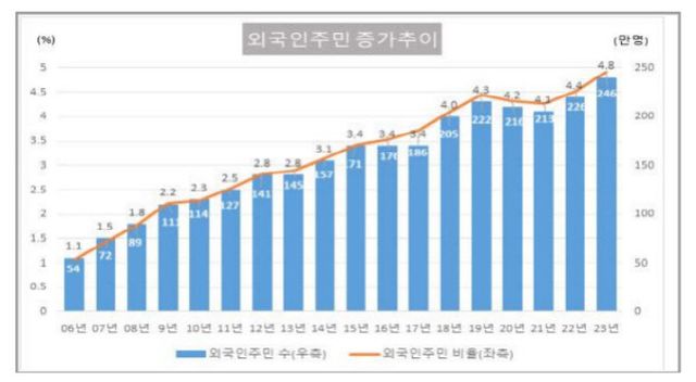 관련 통계가 처음 발표된 2006년 이후 역대 최다 기록으로 지난해 분석 당시에는 226만명이었다. 외국인 주민 수는 인구주택총조사 기준으로 우리나라 총인구(5177만4521명)의 4.8%를 차지한다.