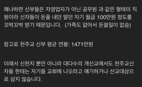 참고로 천주교 신부의 평균 연봉은 1471만 원 이라고 알려져 있다.
