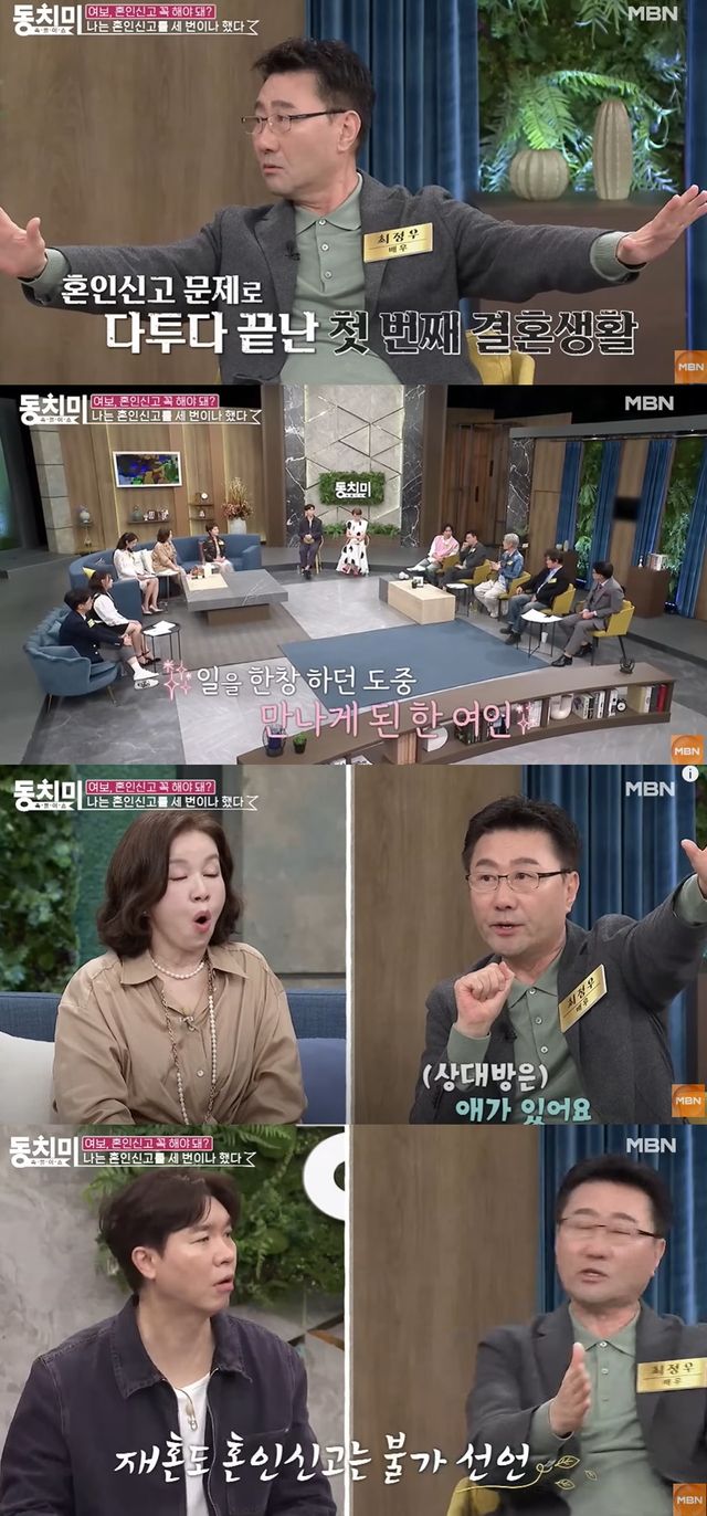 그래서 혼인 신고를 하지 않겠다고 아내에게 선언했지만, 2년 정도 살다가 아내가 말도 없이 혼자 가서 혼인신고를 했음을 알게 됐다고. 최정우는 "하지 말자고 했고, 뚜껑이 열려 끝내 파경을 (결정했다)"고 혼인신고 문제로 첫 번째 결혼 생활이 끝맺음 됐다고 말했다.