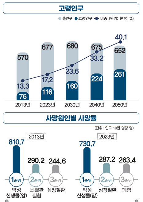 지난해 도내 고령자의 사망 원인은 악성신생물(암)이 인구 10만명 당 730.7명으로 가장 많았다. 이어 폐렴 263.4명, 심장질환 287.2명, 뇌혈관질환 226.8명, 알츠하이머병 79.9명 순으로 나타났다. 2013년과 비교하면 암 사망률은 80.0명, 뇌혈관질환 사망률은 63.4명 줄었다. 폐렴 사망률은 70.8명, 심장질환 사망률은 42.6명 증가했다.