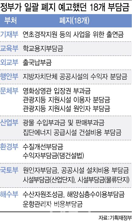다만 정부의 시도는 국회 입법제출 과정에서 무산됐다. 법안을 접수하는 의사국에서 18개 부담금 관련 법안을 상임위 구분 없이 기재위에 통합 심사할 경우, 국회 심의권이 침해된다고 판단했기 때문이다. 야당 역시 지난 6월 정책현안보고를 통해 “기재부의 극단적 행정 편의주의 입장에서 입법권을 갖는 국회를 무시하는 태도”라고 강력하게 반대했다.