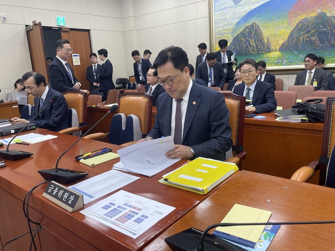 김병환 금융위원장이 24일 열린 국회 정무위 국정감사에 출석해 금융권 현안을 살펴보고 있다. = 김정후 기자