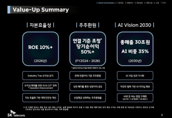 24일 SK텔레콤은 자본효율성 개선, 중장기 주주환원 정책, AI 사업 비전 등을 담은 기업가치제고 계획을 공시했다.