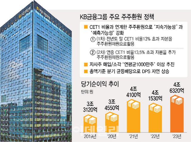 미국 출장 중인 양종희 KB금융그룹 회장까지 직접 밸류업 방안을 발표하며 기업가치 제고 의지를 나타냈다. 내년부터 보통주자본 비율(CET1비율) 13%를 초과하는 잉여자본을 주주에게 환원하고 주주환원율을 높이기 위해 그룹 경영관리체계 개편은 물론 일선 영업현장 직원의 핵심성과지표(KPI)도 조정한다는 계획이다. 자사주 매입·소각도 연평균 1000만주 이상 수준으로 추진하기로 했다.