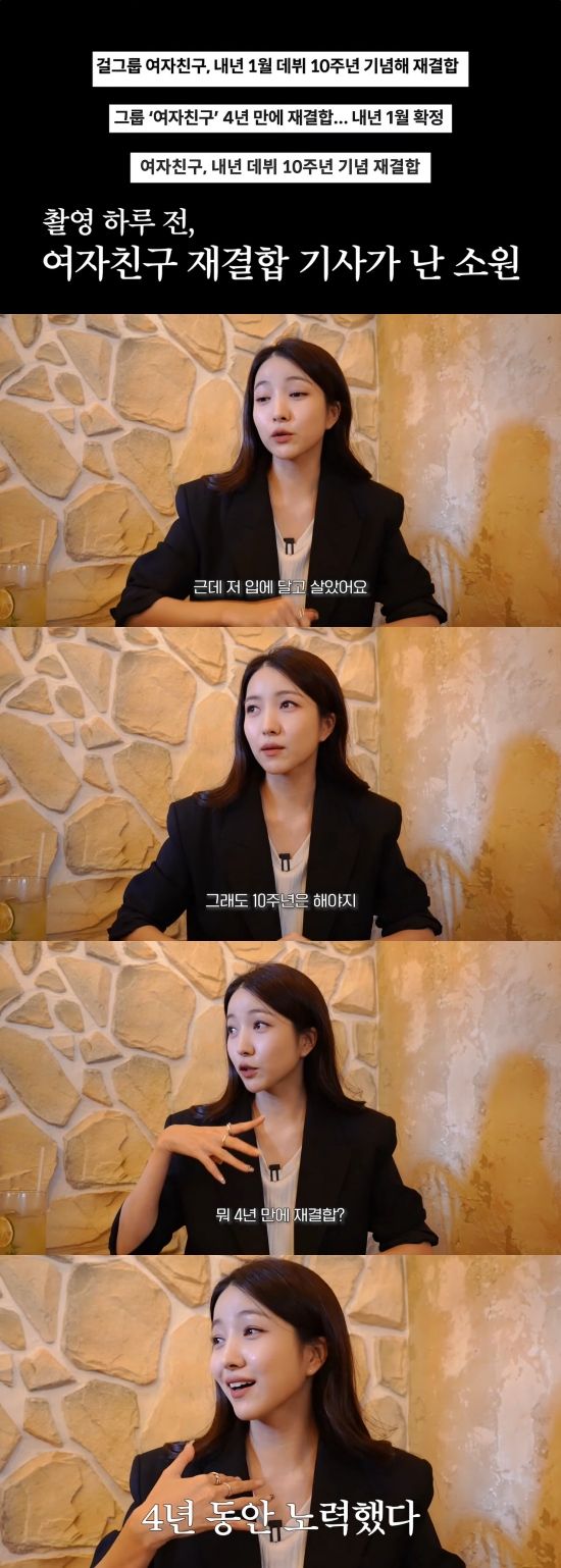 이에 대해 김소원은 "저는 예전부터 입에 달고 살았다. 옛날부터 진짜 '그래도 10주년은 해야지'라고 오래 전부터 이야기했다"며 "4년 만에 재결합 이런 식으로 났는데, 4년 동안 노력했다"고 말했다.