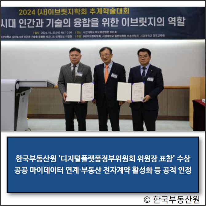 한국부동산원이 지난 23일 서울 서강대에서 열린 '2024 이브릿지학회 추계학술대회'에서 디지털플랫폼정부 발전 유공 부문 '디지털플랫폼정부위원회' 기관 표창을 수상했다.