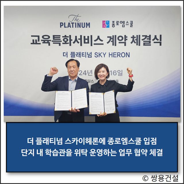 쌍용건설이 경기도 평택에 공급하는 '더 플래티넘 스카이헤론'과 종로엠스쿨이 교육혜택 서비스를 제공하는 업무협약(MOU)을 체결했다.
