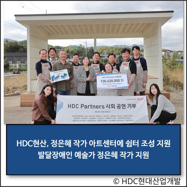 HDC현산은 지난 23일 우수 협력사와 함께 경기 양평에 있는 어메이징 아웃사이더 아트센터를 방문해 인테리어 개보수와 외부 쉼터 조성 공사를 위한 모금 기부 전달식을 진행했다.