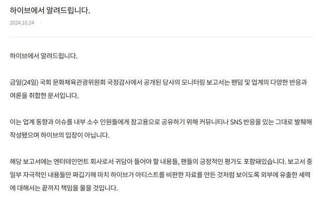 하이브는 국정감사 도중 공식 홈페이지를 통해 “금일(24일) 국회 문화체육관광위원회 국정감사에서 공개된 당사의 모니터링 보고서는 팬덤 및 업계의 다양한 반응과 여론을 취합한 문서”라면서 “이는 업계 동향과 이슈를 내부 소수 인원들에게 참고용으로 공유하기 위해 커뮤니티나 SNS 반응을 있는 그대로 발췌해 작성됐으며 하이브의 입장이 아니다”라고 반박했다.