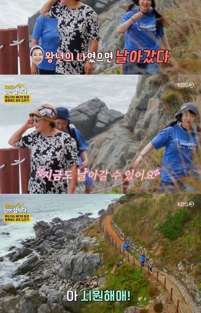 박원숙은 시원한 바닷바람과 멋진 풍광에 역대급 텐션으로 앞장서는 모습을 보여 눈길을 끌었다.