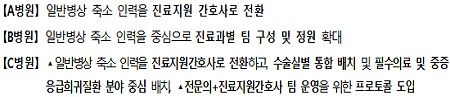 ‘전문의+진료지원간호사 팀 기반 업무’를 도입해 중증환자 대응 역량을 강화하고, 진료지원 간호사의 역량 강화를 위한 자체 교육훈련 프로그램을 내실있게 운영하도록 한다.
