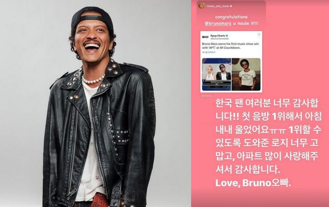 브루노 마스는 25일 자신의 인스타그램 스토리에 “한국 팬 여러분 너무 감사합니다. 첫 음방 1위를 해서 아침내내 울었어요”라며 “1위 할 수 있도록 도와준 로제 너무 고맙고, ‘아파트’ 많이 사랑해주셔서 감사합니다”라는 글을 게재했다.