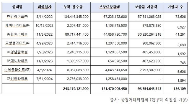 특히 가입자 수 7만 3천 명, 누적 선수금 1,344억 원이었던 한강라이프(주)와 가입자 수 4만 1천 명, 누적 선수금 897억 원이었던 ㈜한효라이프의 경우 각각 100억 원 안팎의 보상금액을 지급하지 못한 것으로 나타났다.