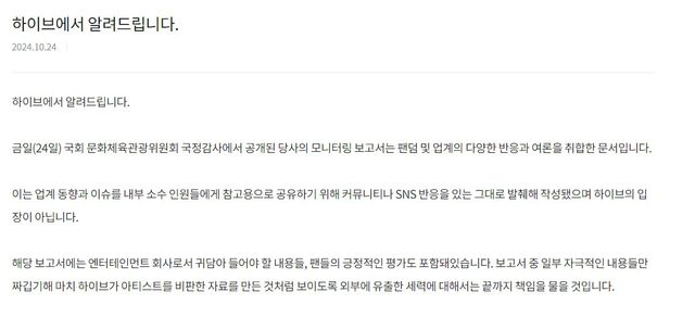 그런데 직후 하이브 공식 홈페이지에는 해당 문건에 대해 "해당 보고서에는 엔터테인먼트 회사로서 귀담아 들어야 할 내용들, 팬들의 긍정적인 평가도 포함돼있다"면서 "보고서 중 일부 자극적인 내용들만 짜깁기해 마치 하이브가 아티스트를 비판한 자료를 만든 것처럼 보이도록 외부에 유출한 세력에 대해서는 끝까지 책임을 물을 것"이라는 내용의 입장문이 올라왔다.