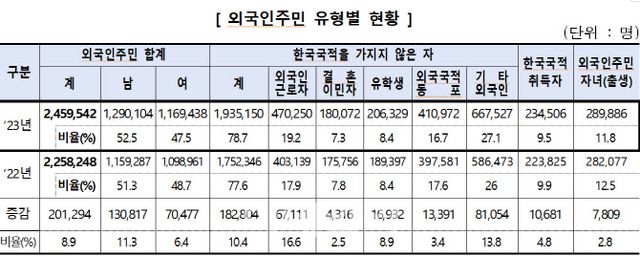 이는 통계가 처음 발표된 2006년 이후 역대 최다 기록이다. 지난해 226만명으로 외국인주민 수가 역대 최다를 기록한 데 이어 2년 연속으로 외국인주민 수 최다 기록을 경신했다.