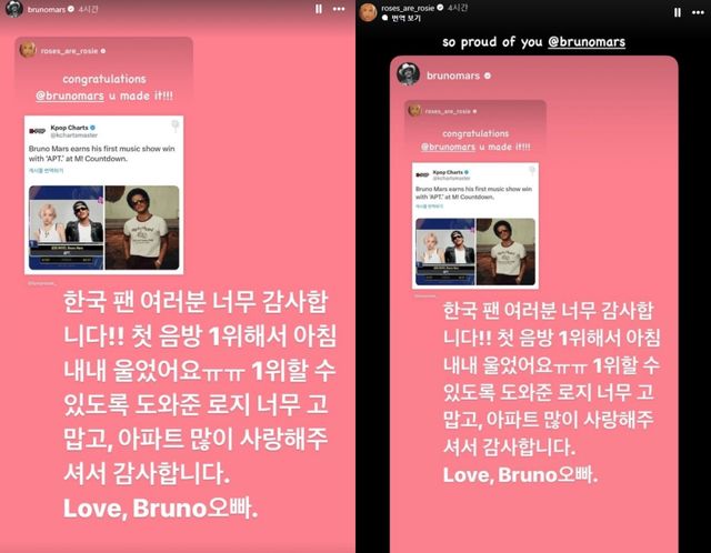 25일 브루노마스는 로제가 자신의 인스타그램에 올린 '엠카' 1위 소식을 인용하며 "한국 팬 여러분, 너무 감사합니다! 첫 음방 1위해서 아침 내내 울었어요ㅠㅠ 1위할 수 있도록 도와준 로지 너무 고맙고, 아파트 많이 사랑해주셔서 감사합니다. Love, Bruno오빠"라는 소감을 공개했다.