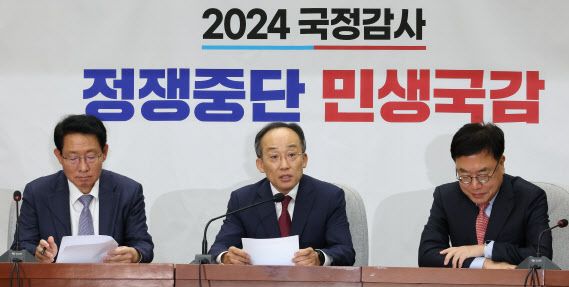 추경호 원내대표는 이날 서울 여의도 국회에서 열린 국감대책회의가 끝나고 기자들과 만나 한동훈 국민의힘 대표가 전날 ‘당 대표는 원내와 원외를 통괄한다’고 말한 것에 대해 이같이 답했다.