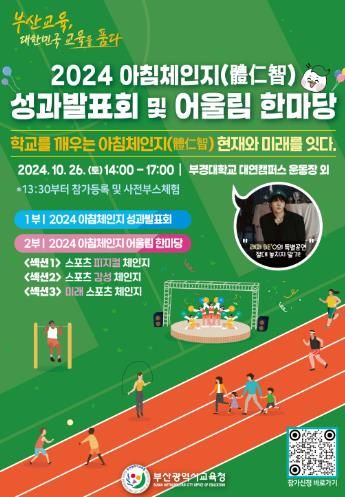 부산교육청은 ‘학교를 깨우는 아침체인지(體仁智), 현재와 미래를 잇다’를 주제로 부스 체험·공연 등 ‘사전 행사’, 1부 ‘성과발표회’, 2부 ‘어울림 한마당’ 등 다채로운 프로그램으로 행사를 운영한다.
