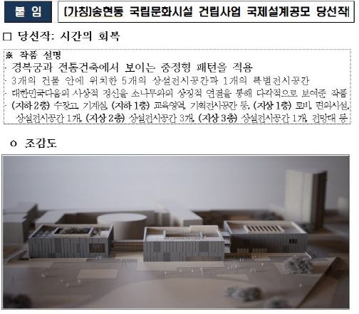 문체부에 따르면 지난 10월10일까지 진행한 설계 공모에는 국내외 67개 팀이 참여했으며, 심사위원 만장일치로 ‘시간의 회복’을 선정했다.